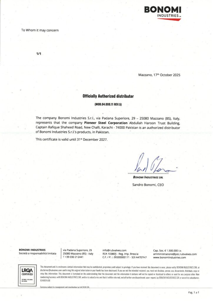 Bonomi Industries S.r.l. represents that Pioneer Steel Corporation is an authorized distributor of Bonomi Industries S.r.l.’s products in Pakistan.