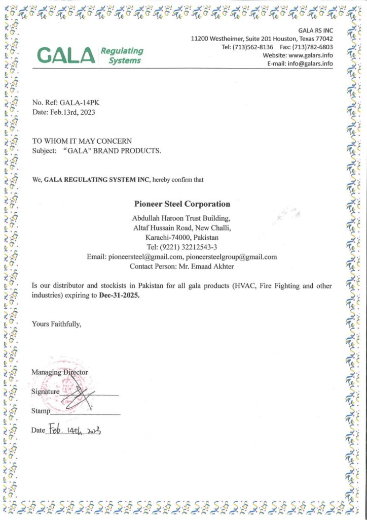 GALA REGULATING SYSTEM INC confirms that Pioneer Steel Corporation is their distributor and stockist in Pakistan for all Gala products (HVAC, Fire Fighting and other industries).