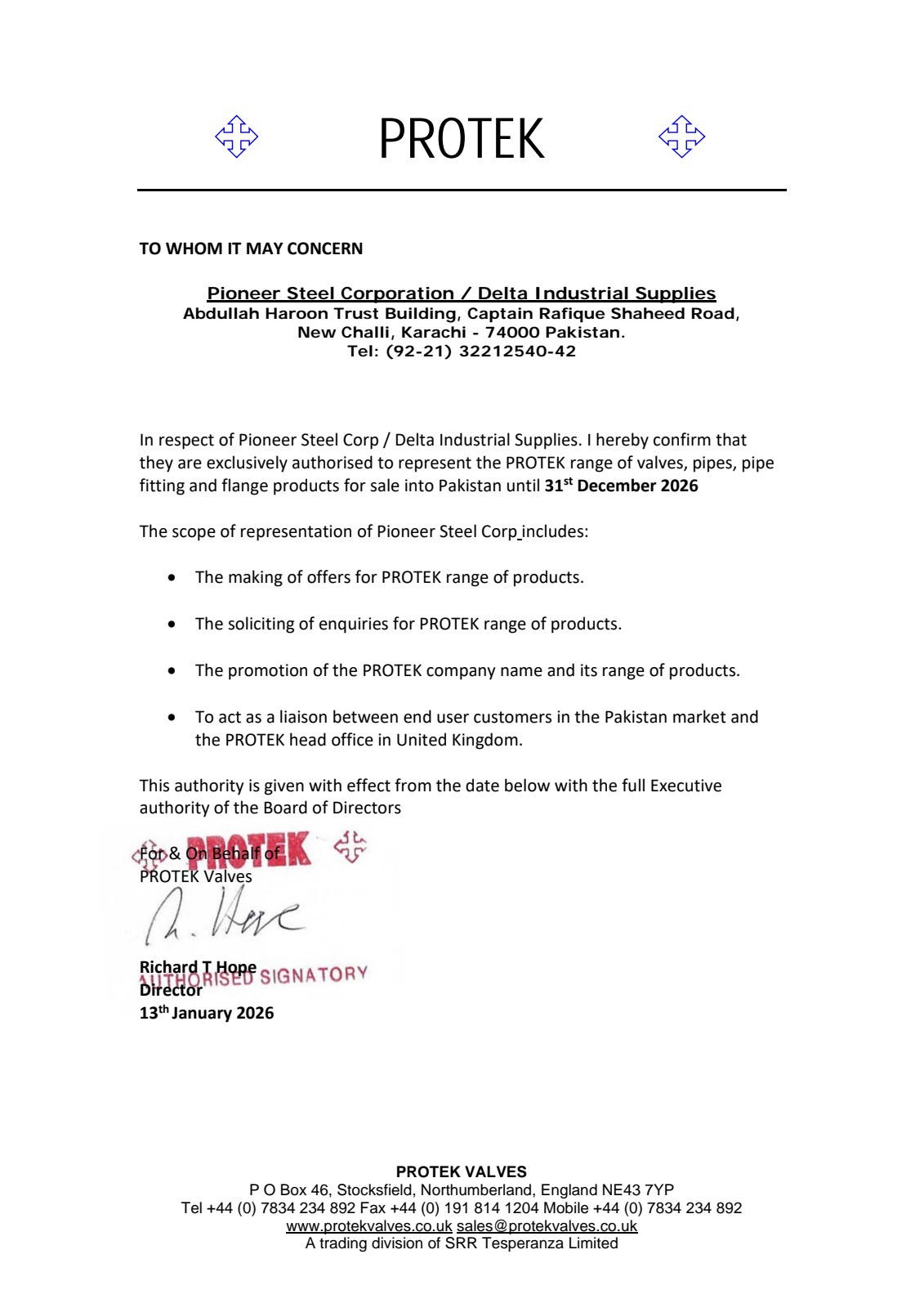 Pioneer Steel Corporation / Delta Industrial Supplies is exclusively authorised to represent the PROTEK range of valves, pipes, pipe fitting and flange products for sale into Pakistan.